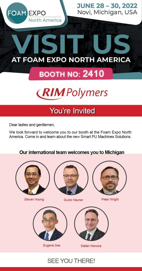 RIM Polymers is proud to be exhibiting in the upcoming Foam Expo North America from 28 June to 30 June 2022